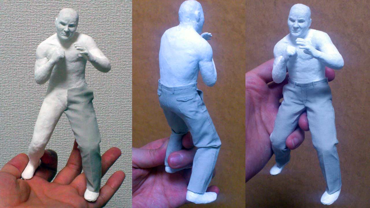 The styrofoam blocks are carved to get the overall shape and proportions. Hands and feet are added. The lightweight armature can even stand on its own.