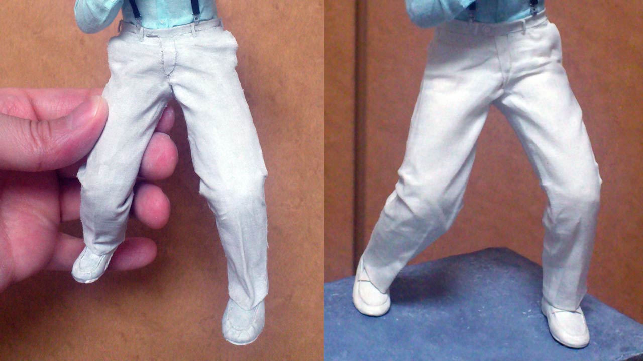 The dress shoes took a couple of tries to make. Vinyl, egg shell white acrylic paint and lots of polishing to get that weathered leather look. I tried to bleach the pants