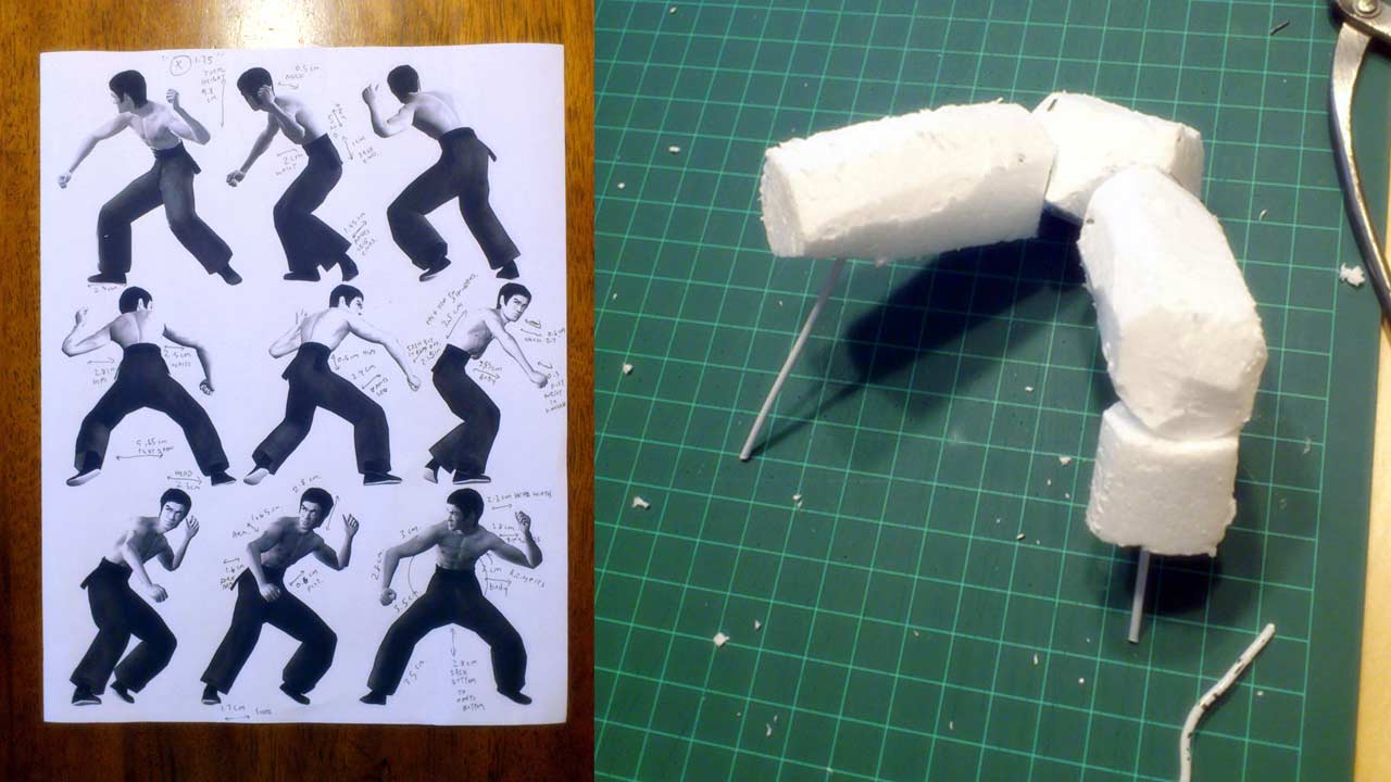 Two images side by side one of a model sheet reference of Tang Lung's pose in nine angles and a wire armature of legs and hits coated in styrofoam